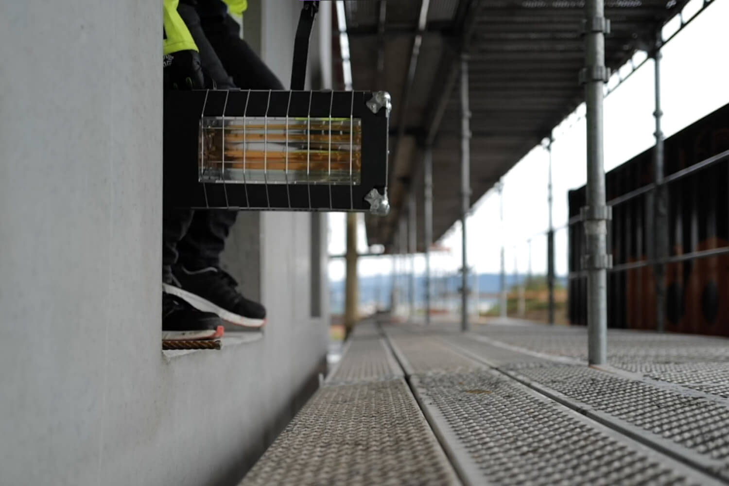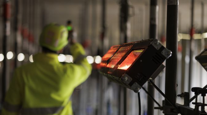 Braa nikker mot Suncon Zero 3 som er festet til stillaset under ham. Når ett område er ferdig, hekter de av stråleovnene og forflytter dem enkelt til neste etasje. På natters tid står lampene rettet direkte mot paller med teglstein, så de blir varme nok til å settes opp på dagtid.